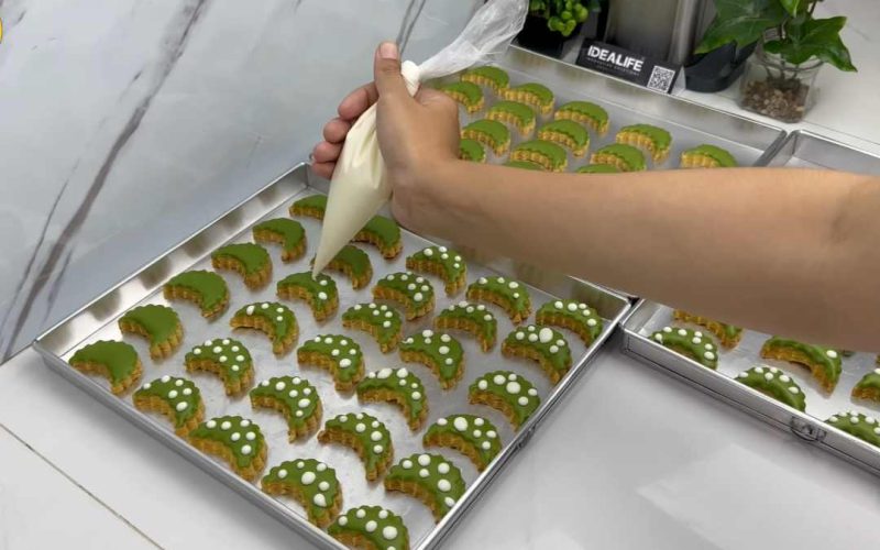 Melalui kanal YouTube Figo Alfares, kita diperkenalkan pada kreasi kue berbentuk bulan sabit yang tampil menggemaskan dengan balutan cokelat hijau dan motif polkadot putih. Keunikan kue ini terletak pada perpaduan rasa manis khas green tea di luar dan gurihnya keju parut di dalam adonan yang lumer saat digigit.